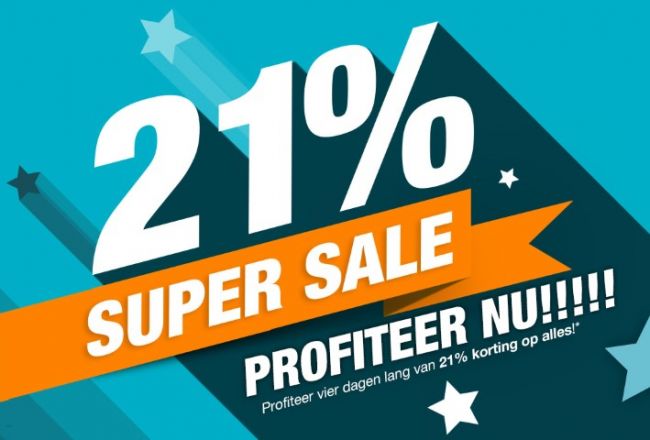 De Super Sale Dagen lopen online van donderdag 24 oktober t/m zondag 27 oktober. In onze stenen winkel aan de Van Karnebeekstraat 73 in Zwolle zijn wij zondag gesloten en dus heb je t/m zaterdag om te profiteren van 21% korting.