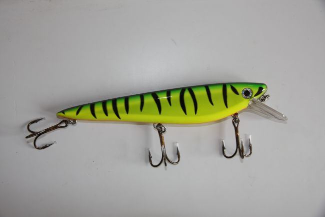 De Krave is een fors stuk kunstaas van Musky Armor uit America. Bedoeld voor Musky en grote snoek, dus wij weten er wel raad mee hier. De Krave laat zich werpen, mits je een stevige hengel hanteert. Trollen gaat ook prima. In beide gevallen toont de Krave zijn echte “crankbait” actie die in dit geval flankerend is. Ik heb het al vaker gezegd; flankers zijn behoorlijk constante snoek vangers. Deze Krave is wel voor de optimisten onder ons of, zo je wilt, diegenen die er net als ik in geloven dat snoek aas niet gauw te groot is. Hij weegt 125 gram en meet inclusief de iets uitstekende zwemlip 26 cm. Een beste joekel dus die je niet zomaar aan elke hengel kunt vissen. Zelf vind ik, zoals bij zoveel echt Musky aas uit de VS, dat de dreggen te groot, maar vooral te dik zijn. Liever even vervangen door iets dundradiger dreggen zou ik zeggen.