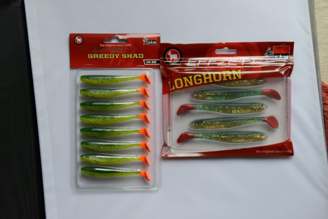 Twee nieuwe shads van DAM kwam ik bij Hengelsport Zunnebeld tegen. De Longhorn is een prima verticaal shadje wat er in diverse kleuren en drie maten is. De kleuren Nerd, Appleseed en Pumpkin (wie verzint die namen?) zijn UV-actief, hetgeen inhoudt dat ze in het donker, onder water dus, meer opvallen. Ongeveer hetzelfde verhaal geldt voor de Greedy shads maar die zijn op één kleur na allemaal UV-actief. Weer een paar nieuwkomers voor het verticalen of dropshotten waar je het eens mee kunt proberen. De verhalen over goeie resultaten zijn er al volop.